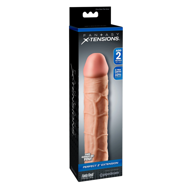 The Perfect 2" Extension is a customizable extension that can be easily trimmed at the base for a perfect fit. It's super-stretchy to accommodate most sizes and snug enough to help you last longer. Your partner will enjoy deeper penetration with the 2" extension at the tip, while the ultra-lifelike shaft makes you 33% thicker all around. The soft Fanta Flesh® material feels just like a second skin, giving you the length, girth, and confidence you need to satisfy your lover.