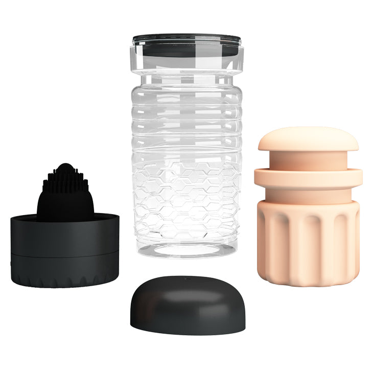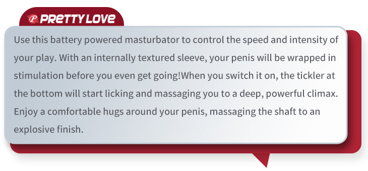 Use this battery powered masturbator to control the speed and intensity of your play. With an internally textured sleeve, your penis will be wrapped in stimulation before you even get going!When you switch it on, the tickler at the bottom will start licking and massaging you to a deep, powerful climax. Enjoy a comfortable hugs around your penis, massaging the shaft to an explosive finish.