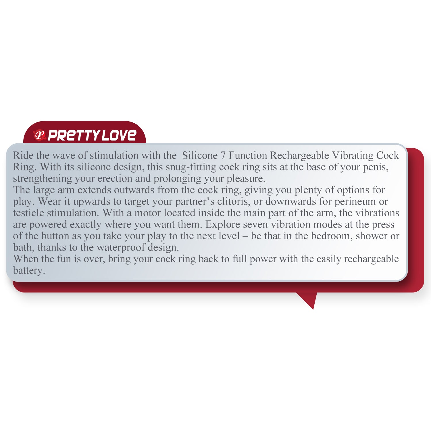 With its silicone design, this snug-fitting cock ring sits at the base of your penis, strengthening your erection and prolonging your pleasure. The large arm extends outwards, giving you plenty of options for play. Wear it upwards to target your partner's clitoris, or downwards for perineum or testicle stimulation. Explore seven vibration modes at the press of the button as you take your play to the next level , be that in the bedroom, shower or bath, thanks to the waterproof design. When the fun is over, bring your cock ring back to full power with the easily rechargeable battery.
