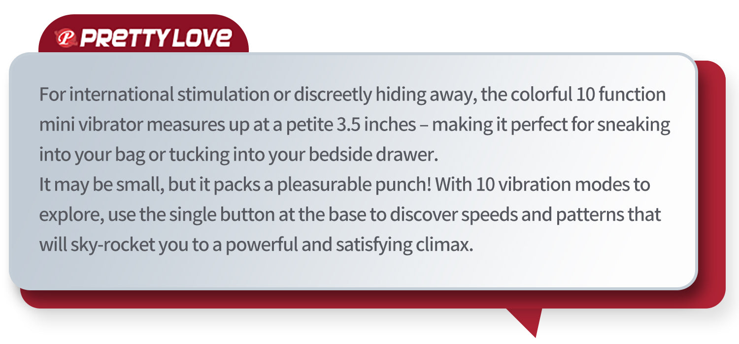 For internal stimulation or discreetly hiding away, these colorful 10 function mini vibrators measures up at a petite 3.5 inches , making it perfect for sneaking into your bag or tucking into your bedside drawer. They may be small, but each one packs a pleasurable punch! With 10 vibration modes to explore and a single button at the base to discover speeds and patterns that will sky-rocket you to a powerful and satisfying climax.