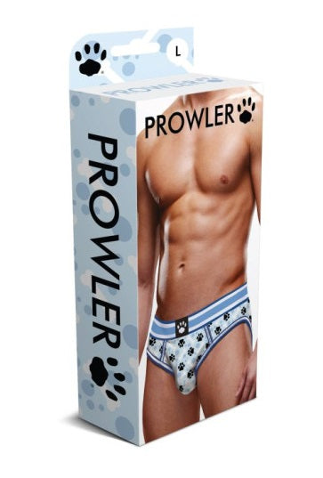 Made from a polyester and spandex blend, these briefs feature a white and blue two tone waistband, the classic Prowler paw logo stitched at the front of the waistband, and a paws design in different shades across the material.