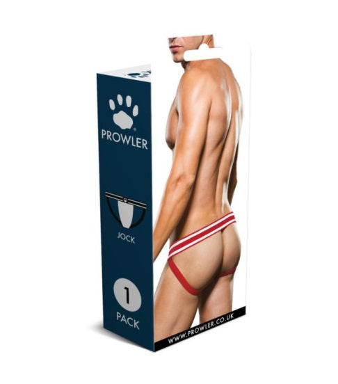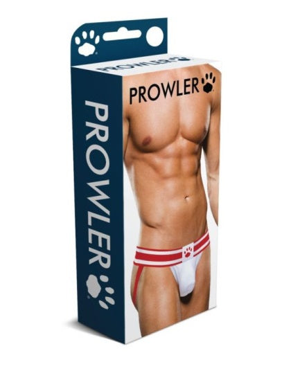 Made from a polyester and spandex blend, this jock strap features a white and red two-tone waistband, the classic Prowler paw logo stitched at the front of the waistband, and thick back straps.