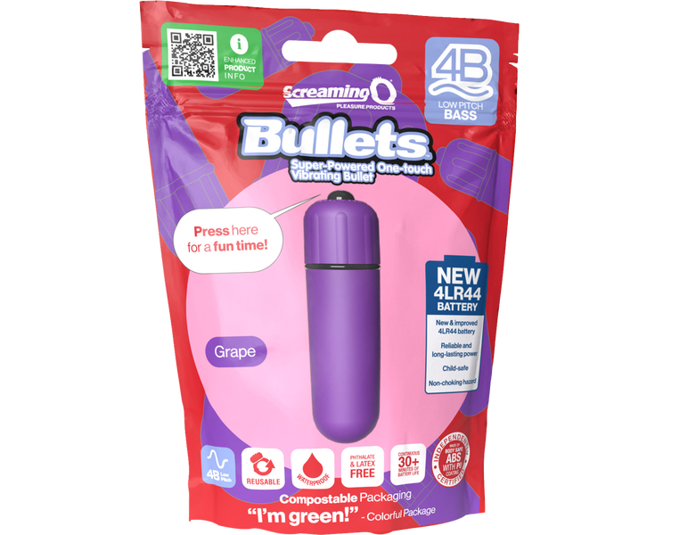 With their compact shape; powerful 4B motor creating bass style vibrations; new 4LR44 longer lasting batteries; and a remarkably smooth, silky feel, the Screaming O 4B Bullets provide deep stimulation for better, more satisfying sex! These super-powered one-touch vibrating bullets are waterproof, available in four colors, and are packaged in compostable, eco-friendly materials.