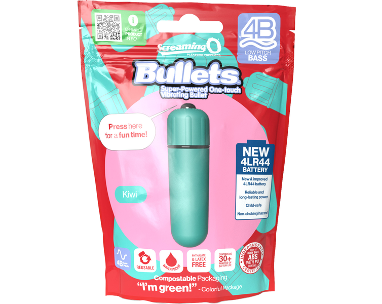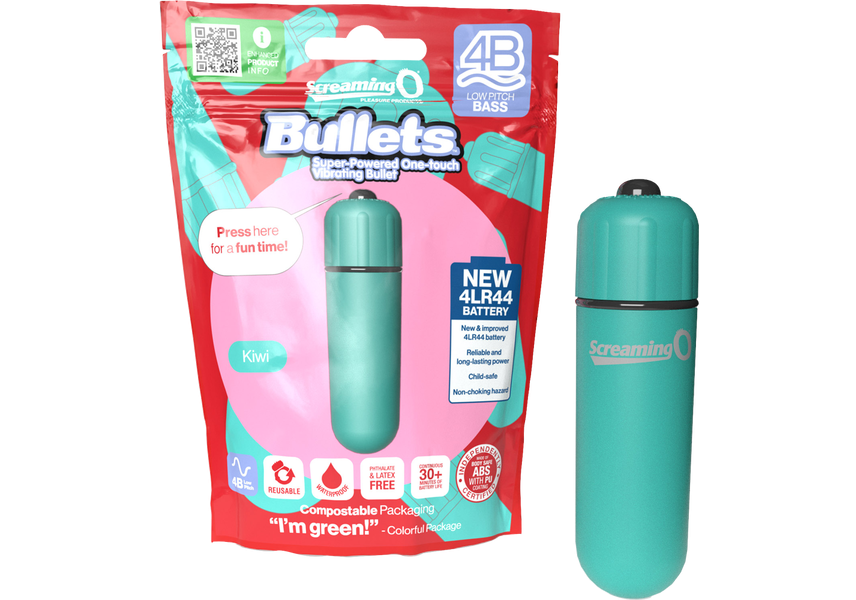 With their compact shape; powerful 4B motor creating bass style vibrations; new 4LR44 longer lasting batteries; and a remarkably smooth, silky feel, the Screaming O 4B Bullets provide deep stimulation for better, more satisfying sex! These super-powered one-touch vibrating bullets are waterproof, available in four colors, and are packaged in compostable, eco-friendly materials.