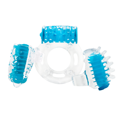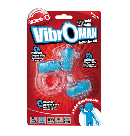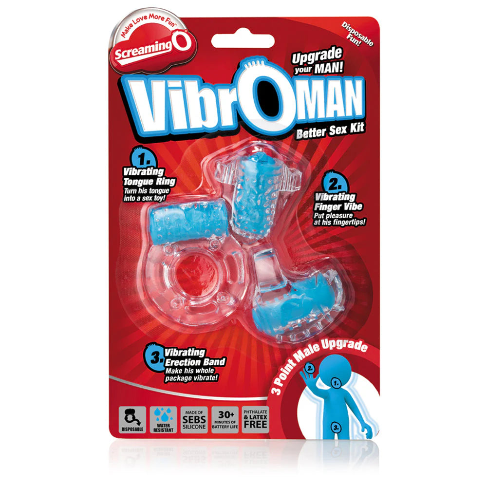 The VibrOman is the ultimate sex toy starter kit for couples exploring vibration in all its forms. This convenient collection offers him a 3-point upgrade with three powerful mini vibes designed to stimulate in very different ways. The mini tongue vibe stretches to fit around his tongue to add a vibrating boost to any cunnilingus session. The mini fingertip vibe sits at the end of any finger and makes it easy to tease, tickle and massage every erogenous zone – especially the clitoris to help orgasms come easier during intercourse! And the vibrating ring makes his whole package vibrate thanks to a super-stretchy ring that fits comfortably around his penis and testicles. When worn with the motor sitting on top, he can stimulate her clitoris with every thrust and intensity her pleasure in some of her favorite sex positions. All three powerful vibrators are made with lab-tested SEBS material for a quality and body-safe experience and are completely disposable, so you can take your VibrOman home or on vacation and leave the evidence behind!