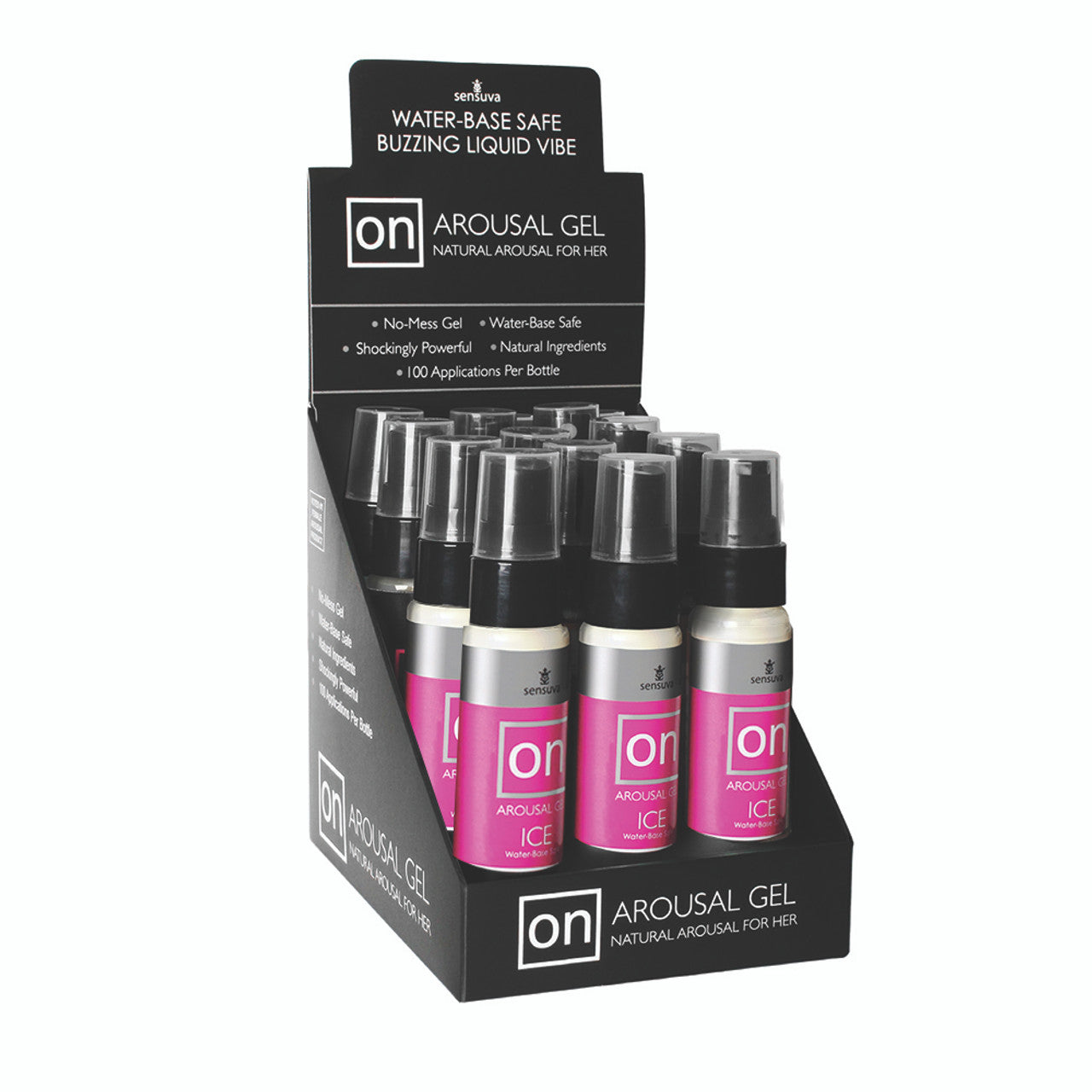A display stand with 12 bottles of On for Her Arousal Gel. Select from either Original, Ice, Coffee Cake or an assorted mix. Single flavours contain 12 pieces of that flavour. On for Her Arousal Gel. Includes tester of each and sticks