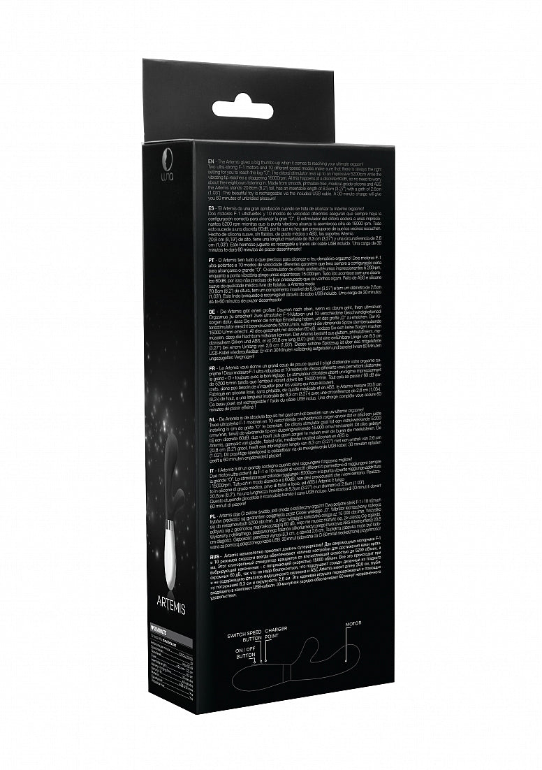 The Artemis gives a big thumbs up when it comes to reaching your ultimate orgasm!Two ultra-strong F-1 motors and 10 different speed modes make sure that there is always the right setting for you to reach the big O. The clitoral stimulator revs up to an impressive 5200rpm while the vibrating tip reaches a staggering 15000rpm. All this happens at a discrete 60dB, so no need to worry about the neighbours listening in. Made from smooth, phthalate-free, medical-grade silicone and ABS the Artemis stands 20.8cm (8.2) tall, has an insertable length of 8.3cm (3.27) with a diameter of 2.6cm (1.03). This beautiful toy is rechargeable via the included USB cable. A 30-minute charge will giveyou 60 minutes of unbridled pleasure