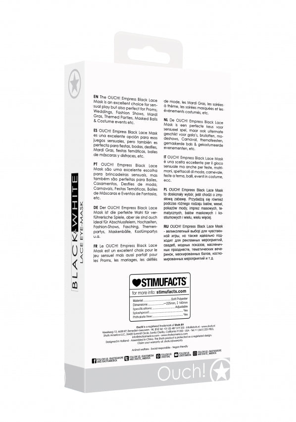 OUCH! Present's a series of 4 handmade, high quality, lightweight and easy to wear masks, detailed with intricate modern Venetian inspired designs. Created with laser-cutting technology from the finest, eco-friendly materials, these masks will really give you an air of seductive mystery! Two quality ribbons will secure the mask in place for long hours of comfortable wear or play and facilitate easy adjustment. The OUCH! Empress Black Lace Mask is an excellent choice for sensual play but also perfect for Proms, Weddings, Fashion Shows, Mardi Gras, Themed Parties, Masked Balls & Costume events etc.