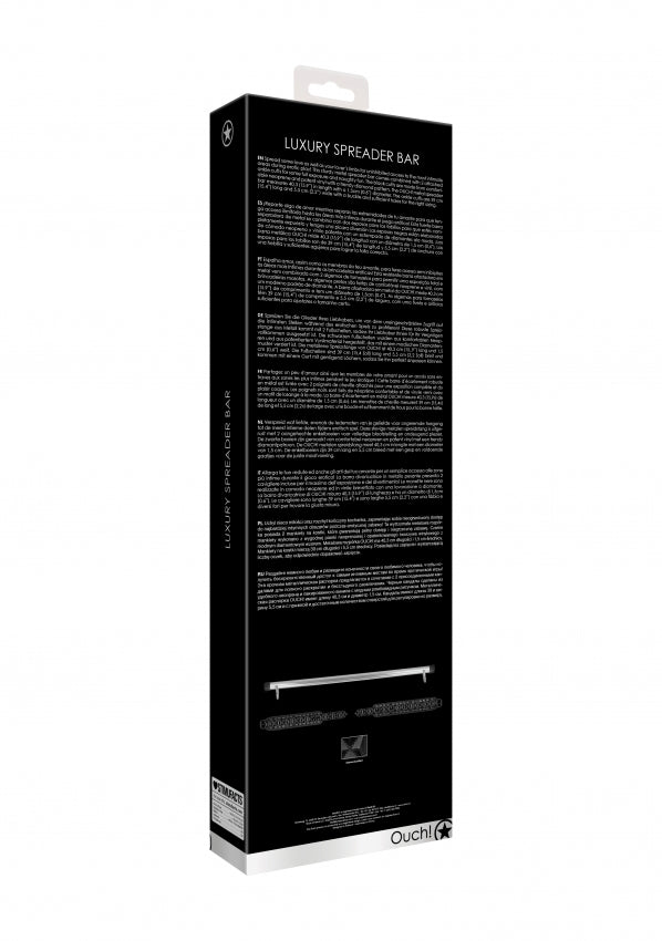 Spread some love as well as your lover's limbs for uninhibited access to the most intimate areas during erotic play! This sturdy metal spreader bar comes combined with 2 attached ankle cuffs for some full exposure and naughty fun. The black cuffs are made from comfortable neoprene and patent vinyl with a trendy diamond pattern. The OUCH! metal spreader bar measures 40,3 (15.9) in length with a 1.5cm (0.6) diameter. The ankle cuffs are 39 cm (15.4) long and 5.5 cm (2.2) wide with a buckle and sufficient holes for the right sizing.