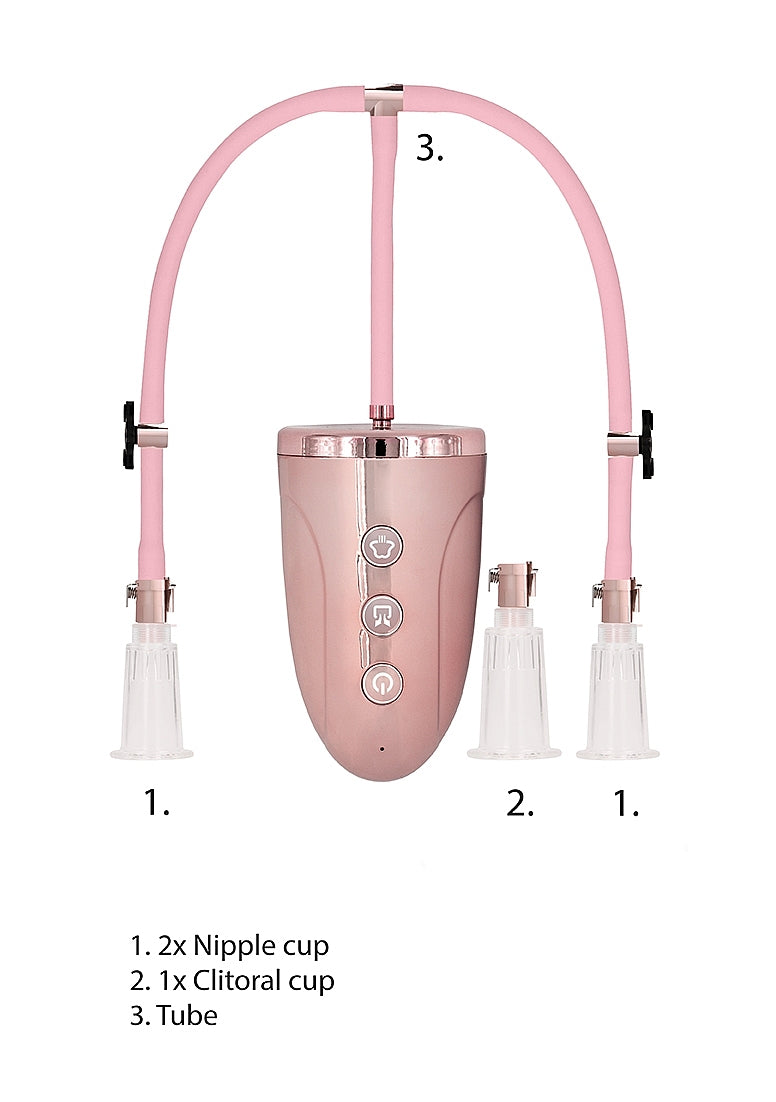 | Specifications | Nipple Cups - Length: 6,8cm | Diameter: 3,2cm | Inner diameter: 1,9cm Clitoral Cup - Length: 7,8cm | Diameter: 3,9cm | Inner diameter: 2,5cm Hose - Length connector to cup: 26,5cm | Length connector to pump: 25,5cm |