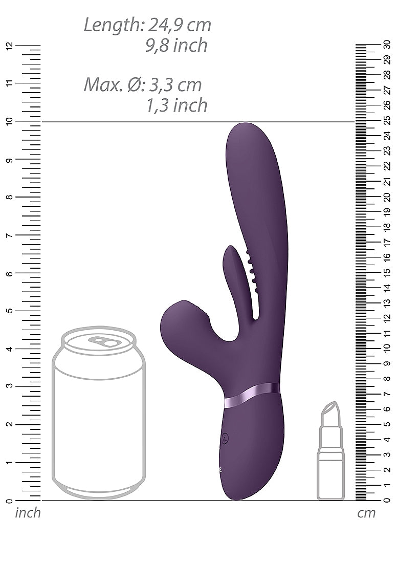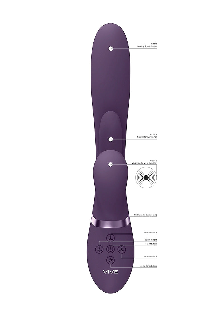 VIVE052 in a class of its own. With three 10-function new generation F1 motors and its advanced technologies (three motors can be independently controlled): one innovative 10-function NG F1 thrusting motor for your G-spot, one first of its kind 10-function NG F1 flapping shaft motor and one pulse-wave 10-function NG F1 motor for clitoral stimulation, it's sure to bring you to maximum heights of pleasure in all your erogenous zones. You can set up your toy with up to 1,000 distinctive settings. Made from 100% silky smooth medical-grade silicone (hypoallergenic), it is totally waterproof (IPX7), and extremely quiet at under 60dB. This means you can use it wherever your heart desires! It contains a USB magnetic rechargeable lithium-ion battery. When fully charged with its USB cable, it will provide 60 minutes of passionate playtime. Just plug, charge and play! When you're getting close to climax, just one-touch of the special function climax button will immediately bring all the motors to full power/speed and, more importantly, bring you to an earth-shattering orgasm. All VIVE vibrators have a full 1-year warranty to protect your investment.