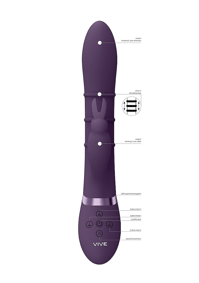 The high class VIVE brand stands for ultimate stimulation through continuous innovation! This top of the range G-spot Rabbit Vibrator boasts a unique feature that will make your toes curl in ecstasy! It has a set of 3 stimulating rings integrated into the smooth, medical grade, silicone shaft that moves up and down for an internal massage like no other. The rings come with 10 different speed modes, while the G-spot stimulator and the Rabbit stimulator both have 10 different vibration modes which give you a mind blowing 1,000 distinct settings to choose from. The VIVE054 is IPX7 waterproof/submersible and rechargeable. A 150 minutes charge will give you 45 minutes of unbridled pleasure at less than 60dB. Furthermore, this unique and Innovative vibrator has a one touch travel lock & climax button, when you are ready to orgasm, just press the climax button and with one touch all motors go to its strongest setting.