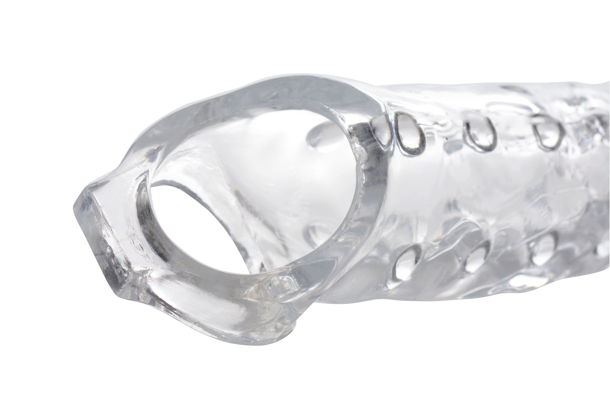 Wrap the strap around your scrotum for more support, security, and sensitivity! Gain three inches of solid length and about an inch of girth with this penis enhancing sleeve! The firm, but flexible material feels realistic, with a bold head and bulging veins all down the shaft. Just lube up and shove your dick inside to give your partner a new sensation to try out during sex! The solid 3 inch tip is followed by a hollow interior that allows for a snug and secure fit. You will love the huge nubs massaging your member on the inside. This phthalate-free and body-safe material is compatible with silicone and water-based lubricants. Use warm water and mild soap or a toy cleaner to clean after use.