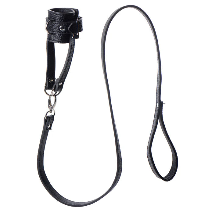 Take your pet for a walk with this humiliating ball-stretcher and leash set! The adjustable stretcher will wrap around his scrotum and tug down, creating a unique sensation that will keep him on edge! Attach the leash to the D-ring on the front or on the straps at the bottom, to pull your plaything around by his balls! You can also use the D-rings to connect weights so that your slave is further tormented.