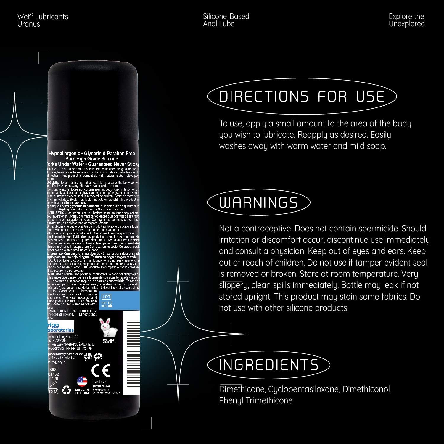 Boldly go to the unexplored with Wet® Uranus® Anal Lubricant™. This formula is thicker for long-lasting lubrication and extra cushioning, making it perfect for anal play. This unique formula has a silky feel, is long-lasting, and latex friendly. Apply a generous amount of Wet Uranus before foreplay and intercourse for adventurous play and pleasure.