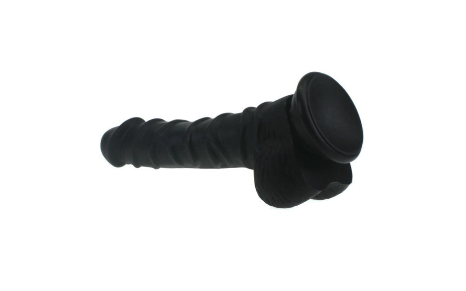 Large Penis shaped dildo with balls and ridged shaft on a suction base in flesh colour.
