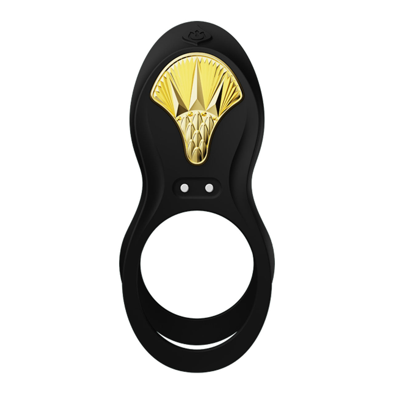 BAYEK also features dual rings that stretch around the scrotum and base of the penis to enhance erection. It can also be worn around the fingers to enhance stimulation by hand. A beautiful, gleaming golden shield-shaped embellishment adorns the exterior of the device for a boost of style.